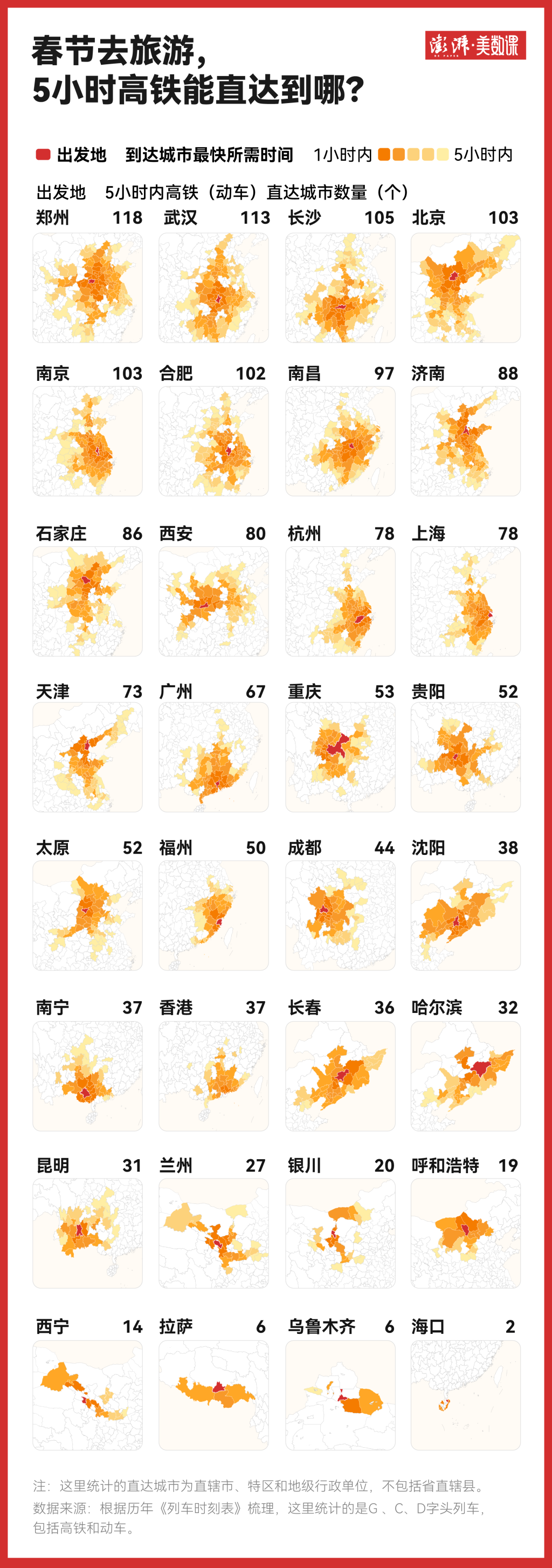 好意思数课使命室曾在2024年梳理过5小时高铁“一又友圈”,因为5小每每时是高铁和飞机两种交通器具的遴选“临界点”。如今咱们再次梳理上万条铁路清亮,并以直达不中转的念念路再次呈现2026年版的主要城市5小时高铁“一又友圈”。