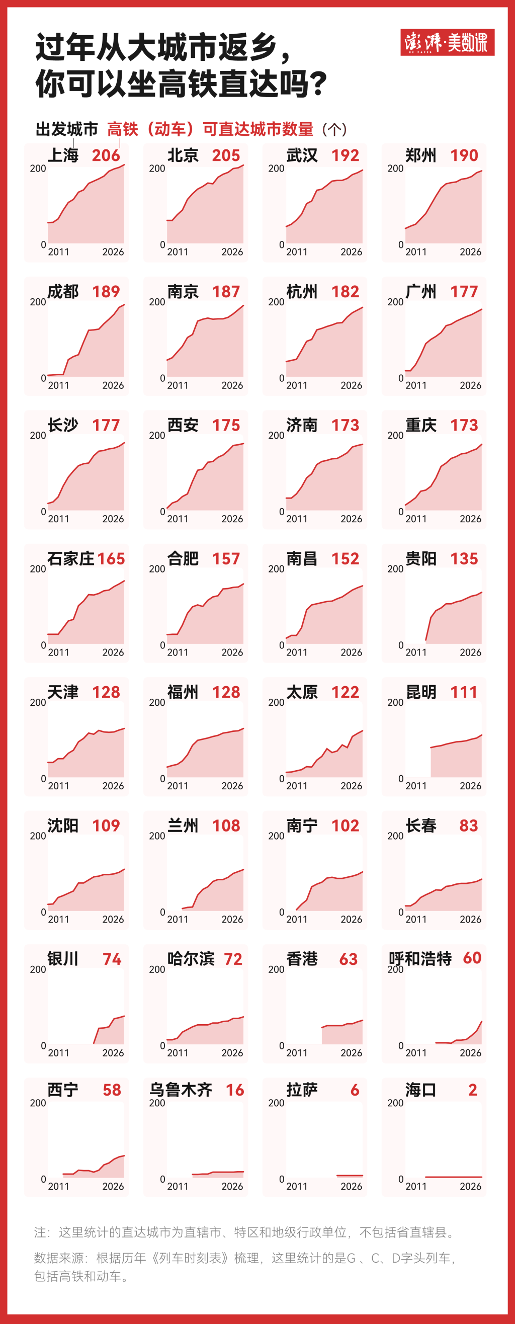 滂沱新闻梳理了从2011年到2026年的列车运行图,分析了主要城市在春运时间高铁及动车能直达的城市数目,发现近十年来,不少城市的高铁直达主宗旨都有了显耀增长。举例在2016年,从北京坐高铁能直达130个城市,但到了本年春运,无须中转就到的城市数目达到了205个,北上可达都都哈尔,南下能到香港。